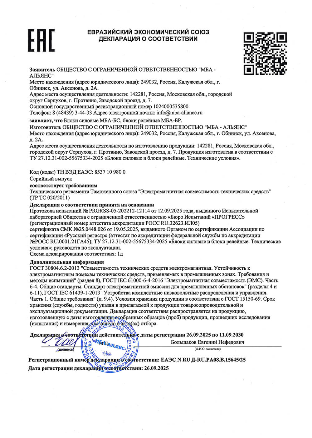 Декларация о соответствии подтверждает, что продукция «Блоки силовые МБА-БС, блоки релейные МБА-БР, выпускаемые по ТУ 27.12.31-002-55675334-2025 «Блоки силовые и блоки релейные. Технические условия» соответствует требованиям Технического регламента Таможенного союза «Электромагнитная совместимость технических средств» (ТР ТС 020/2011)