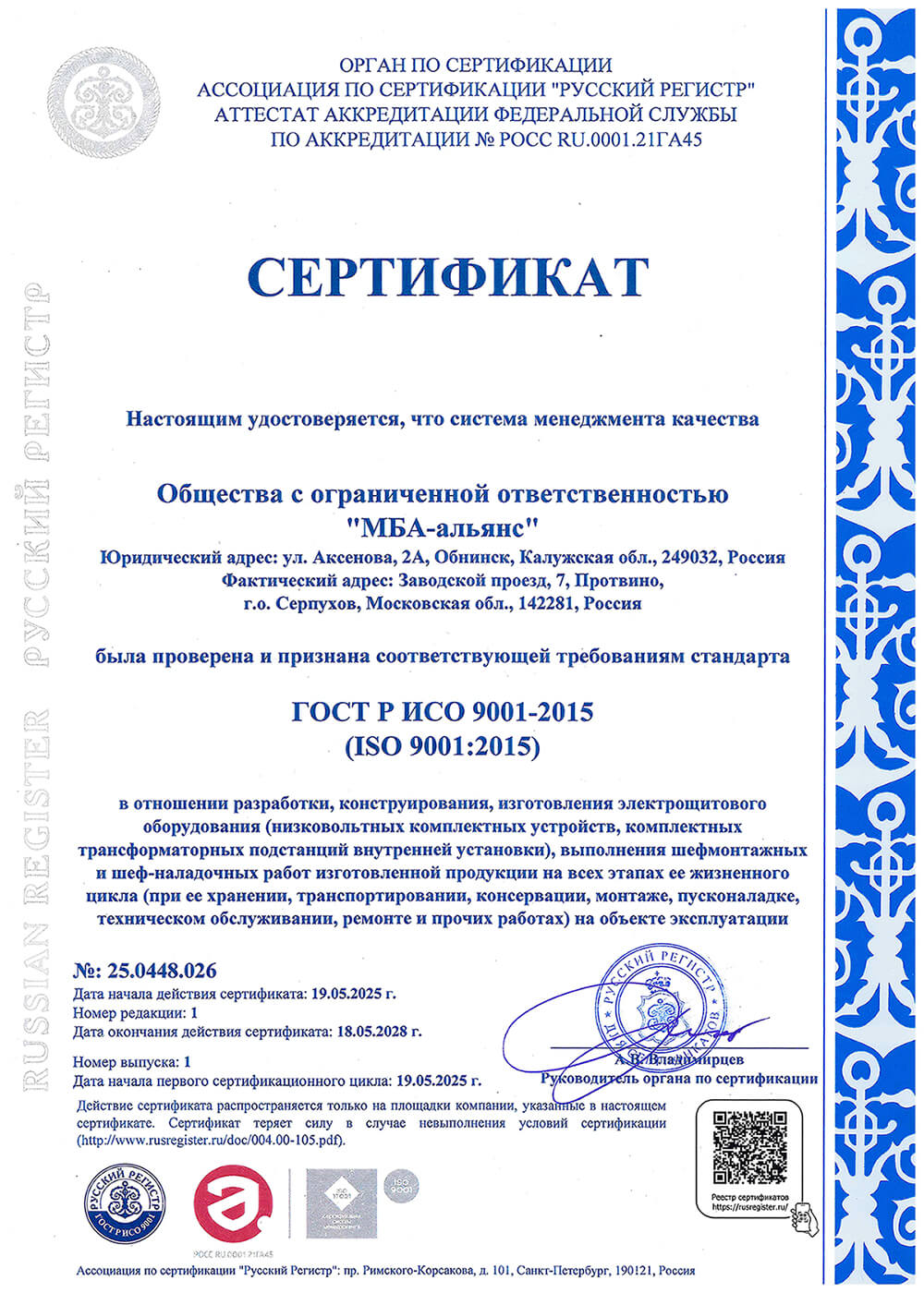Сертификат удостоверяет, что система менеджмента качества ООО «МБА-альянс» была проверена и признана соответствующей требованиям стандарта ГОСТ Р ИСО 9001-2015 (ISO 9001:2015) в отношении разработки, конструирования, изготовления электрощитового оборудования (низковольтных комплектных устройств, комплектных трансформаторных подстанций внутренней установки), выполнения шефмонтажных и шеф-наладочных работ изготовленной продукции на всех этапах ее жизненного цикла (при ее хранении, транспортировании, консервации, монтаже, пусконаладке, техническом обслуживании, ремонте и прочих работах) на объекте эксплуатации.