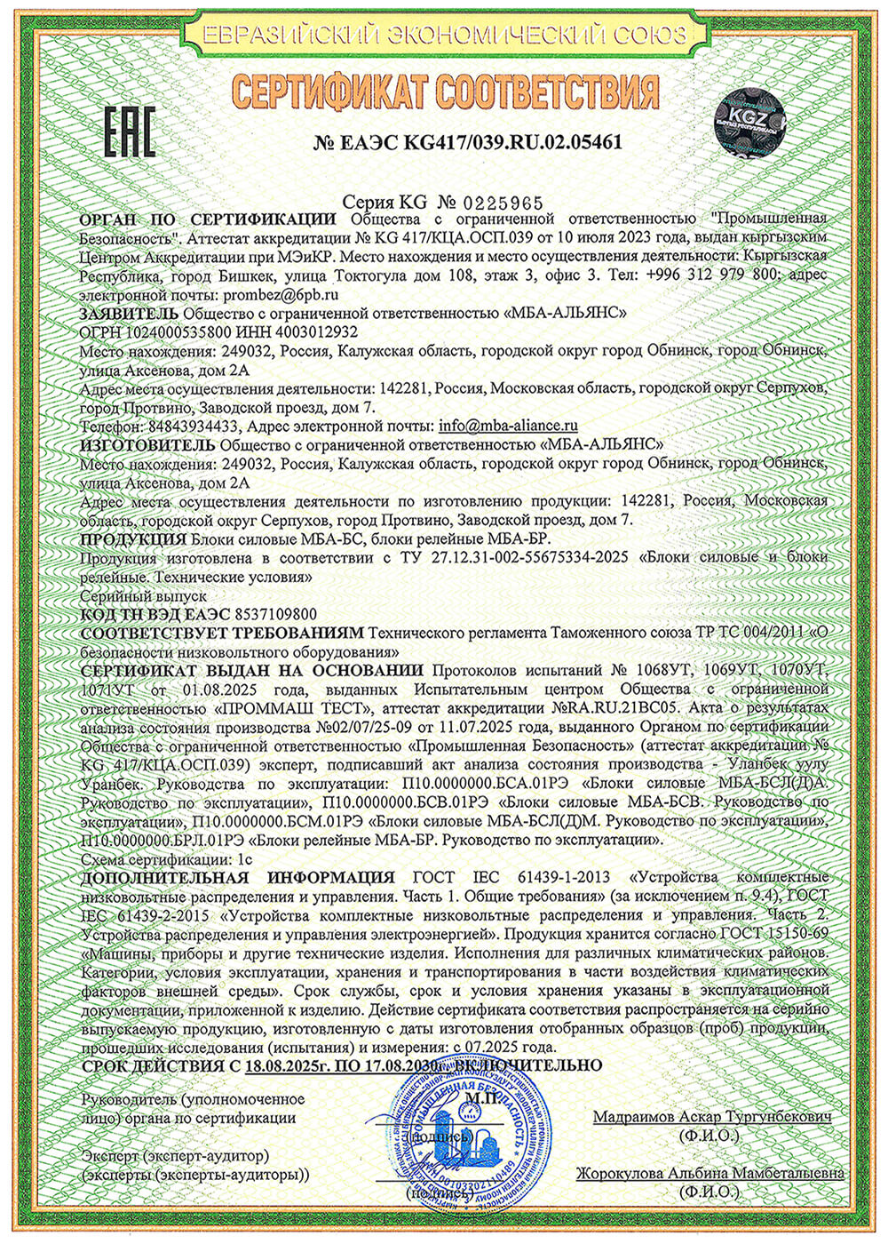 Сертификат соответствия подтверждает, что продукция «Блоки силовые МБА-БС, блоки релейные МБА-БР, выпускаемые по ТУ 27.12.31-002-55675334-2025 «Блоки силовые и блоки релейные. Технические условия» соответствует требованиям Технического регламента Таможенного союза ТР ТС 004/2011 «О безопасности низковольтного оборудования»