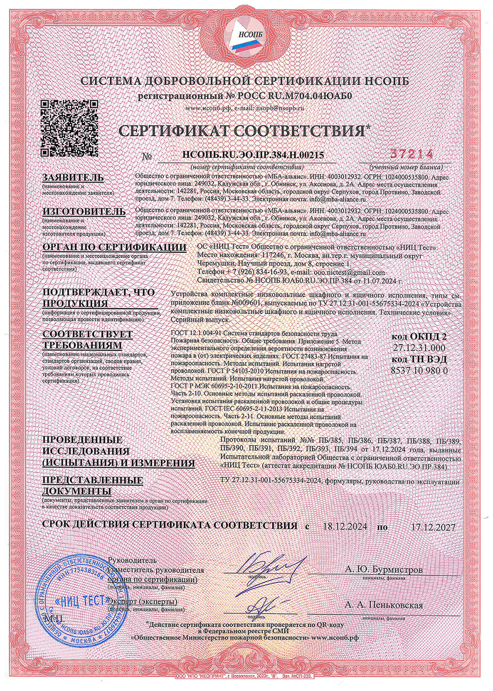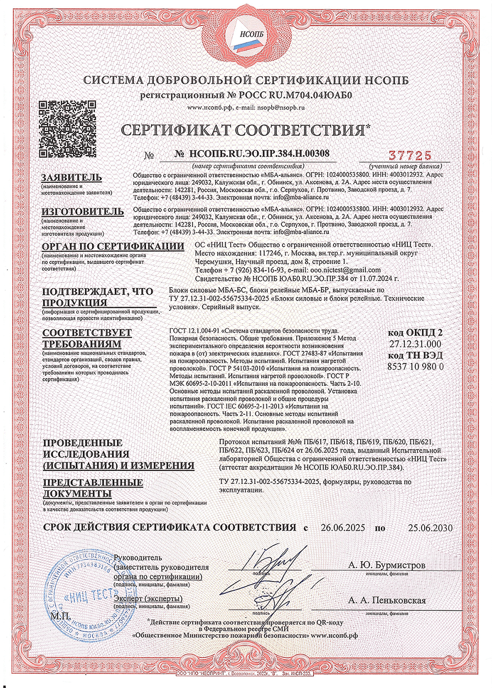 Сертификат соответствия подтверждает, что продукция «Блоки силовые МБА-БС, блоки релейные МБА-БР, выпускаемые по ТУ 27.12.31-002-55675334-2025 «Блоки силовые и блоки релейные. Технические условия». Серийный выпуск» соответствует требованиям ГОСТ 12.1.004-91 «Система стандартов безопасности труда. Пожарная безопасность. Общие требования. Приложение 5 Метод экспериментального определения вероятности возникновения пожара в (от) электрических изделиях», ГОСТ 27483-87 «Испытания на пожароопасность. Методы испытаний. Испытания нагретой проволокой», ГОСТ Р 54103-2010 «Испытания на пожароопасность. Методы испытаний. Испытания нагретой проволокой», ГОСТ Р МЭК 60695-2-10-2011